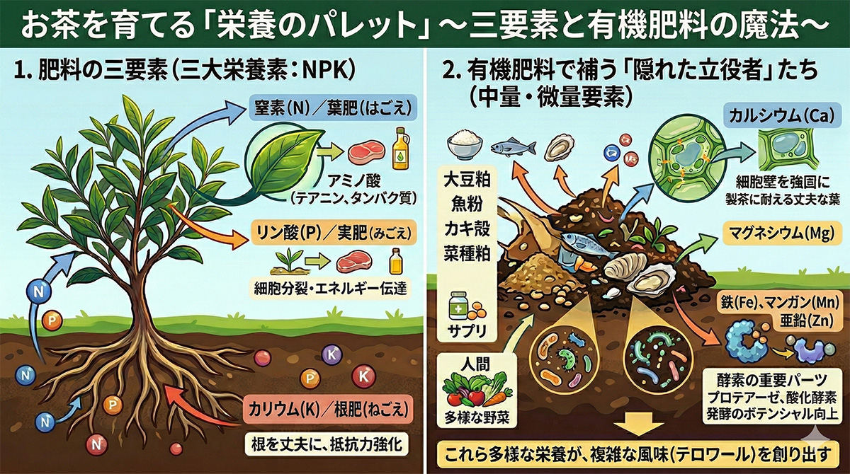 窒素(N / 葉肥・はごえ): お茶づくりにおいて最も決定的な役割を果たす要素。植物の細胞や葉緑素を作るだけでなく、お茶の旨味成分である「テアニン(アミノ酸)」や「巨大なタンパク質」の直接的な材料となります。