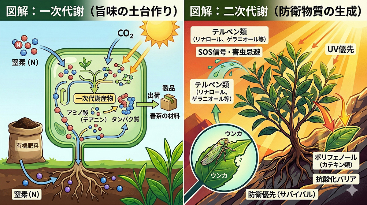 収穫時期が近づき、土の中の窒素が少なくなってくると、チャノキは「このままでは危ない」と成長(一次代謝)をピタリと止めます。