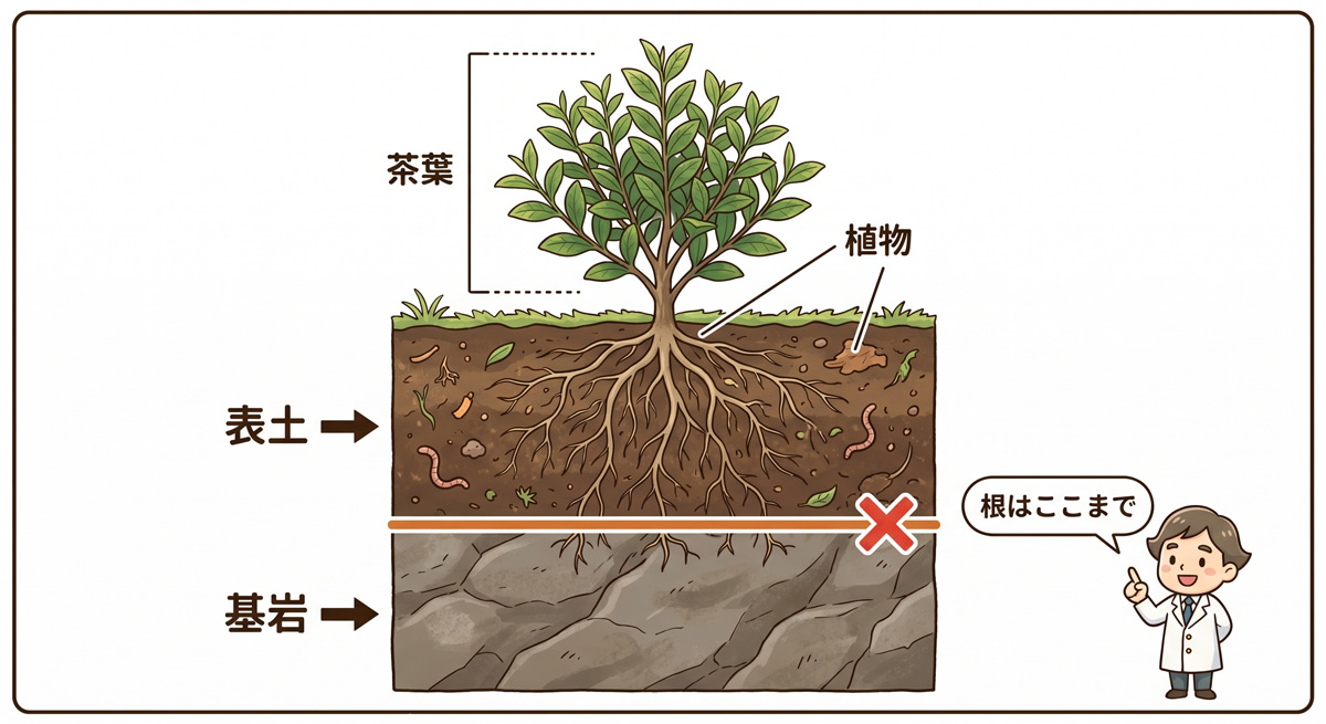 一方、茶の木が実際に根を張っているのは、その岩盤の上を覆っている数センチから数十センチの「表土(土壌)」です。