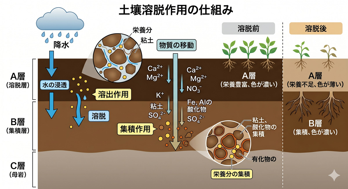 これを土壌学では「溶脱作用(ようだつさよう)」と呼びます。